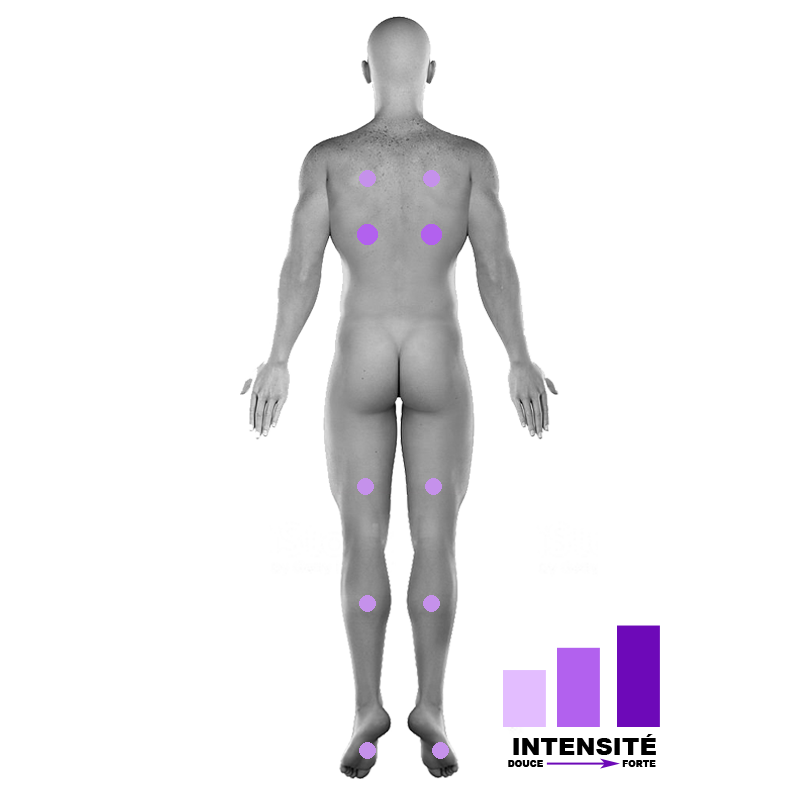 Sur le dos, les jets ciblent la zone scapulaire (entre les omoplates) et le milieu du dos. Ils aident à relâcher les tensions accumulées par la posture quotidienne, à libérer la respiration et à apaiser la fatigue nerveuse.